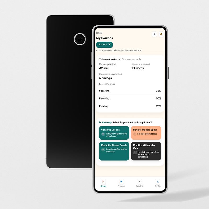 An educational app concept that turns language learning into a journey. By using gamification elements like stamps and badges, I transformed rote memorization into a rewarding adventure. The interface is designed to reduce overwhelm, encouraging users to track their progress and celebrate small wins.