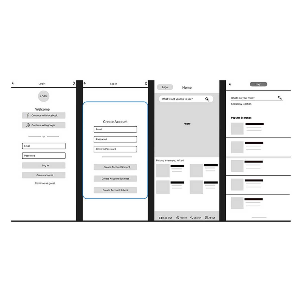 Each wireframe emphasizes a smooth experience from login to enrollment, then to job exploration and profile growth. The layout prioritizes clarity, accessibility, and structure, allowing users to focus on what matters most: building meaningful careers and community connections.